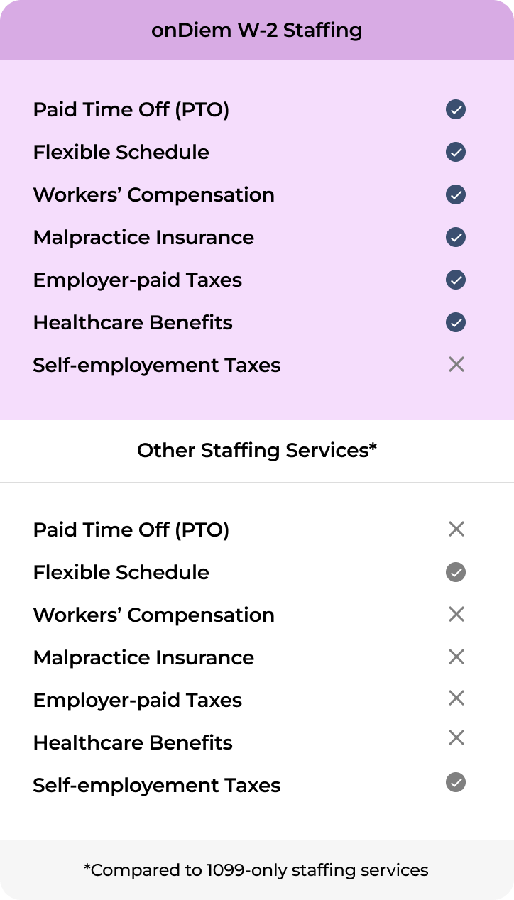 onDiem connects you with licensed, W-2 compliant professionals who are ready to work.